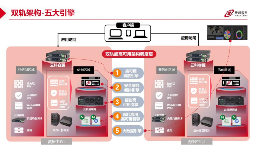 数据中心架构在自主创新的过程中分解为现有架构的非信创区和信创区的两个业务区域,在每个数据中心分为信创区和非信创区后,在两个区域之间的跨区跨域协同方法,神州db视讯官网通过5大引擎实现多层次的应用可持续性实践。