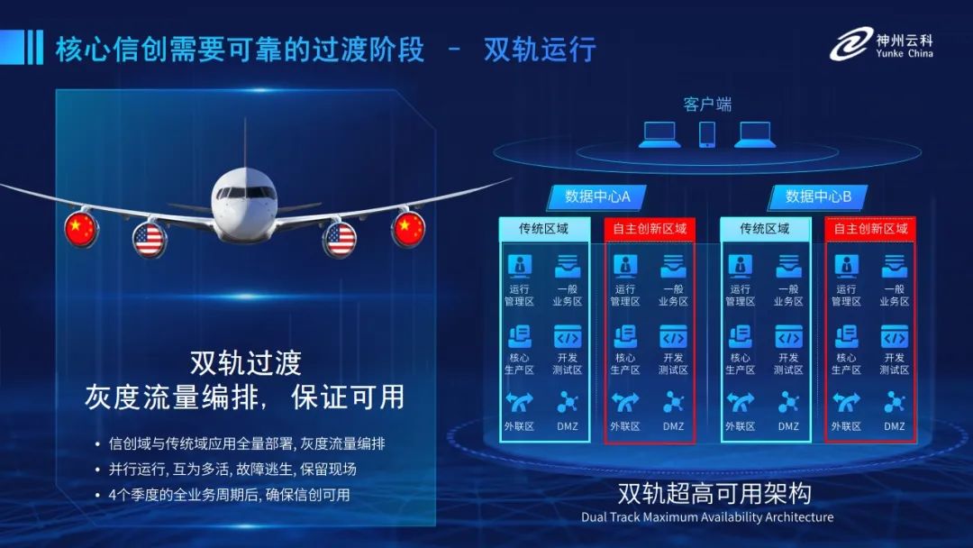 为帮助客户更好地应对数字经济时代对应用可持续性的高要求,实现信创与数字化兼得,神州db视讯官网推出了双轨超高可用架构。双轨超高可用架构在双活数据中心的分区调度基础上,增加信创域和非信创域的分域调度,实行信创域与传统域应用全量部署,使双中心运营变为双中心四区域并行运行,互为多活,将传统架构变为分区分域协同的多活双轨超高可用架构。帮助客户在新架构下,保障“信创”的同时解决性能瓶颈,提升稳定性,保证应用可持续性,最终实现信创区域和非信创区域的平滑过渡,完成国产化替代目标。”